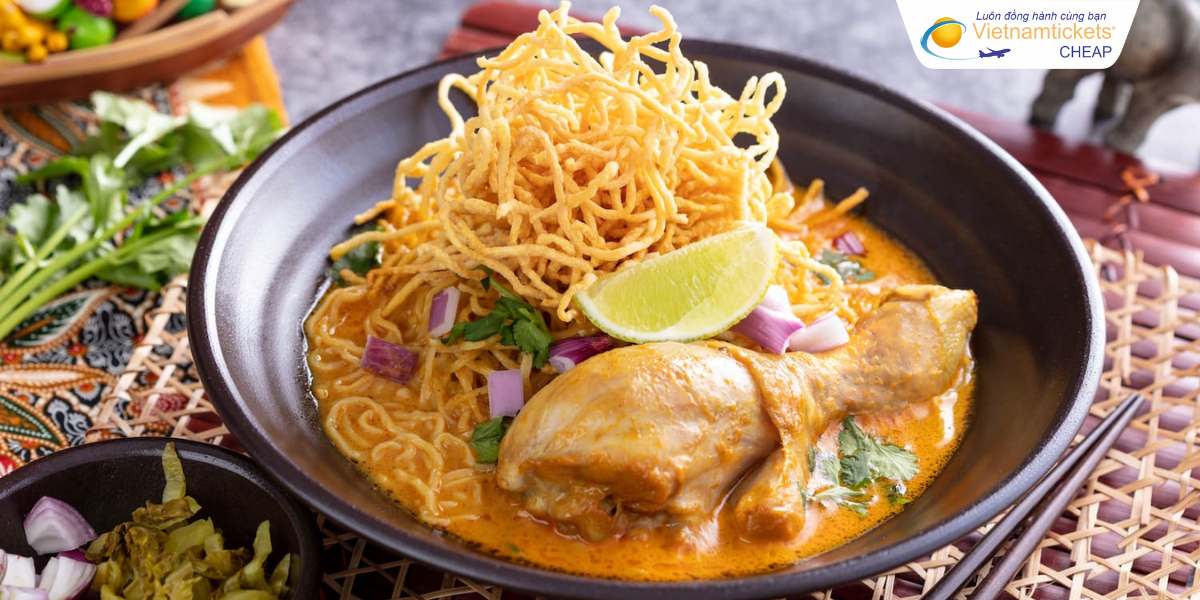 Khao Soi: Món mì cà ri dừa nổi tiếng của miền Bắc Thái Lan, với sợi mì giòn phủ trên mì trứng mềm, ăn cùng thịt gà hoặc thịt bò, kèm rau sống và chanh.